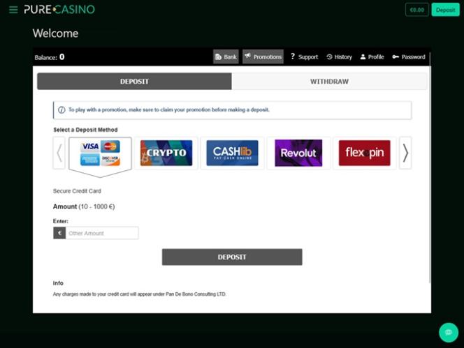 Pure Casino on Pan De Bono Consulting Limitedin omistama nettipelaamisen brändi. Kasino toimii Windward Circle BV:n myöntämän lisenssin alaisuudessa ja sitä sääntelee Curaçaon eGaming Licensing Authority.
