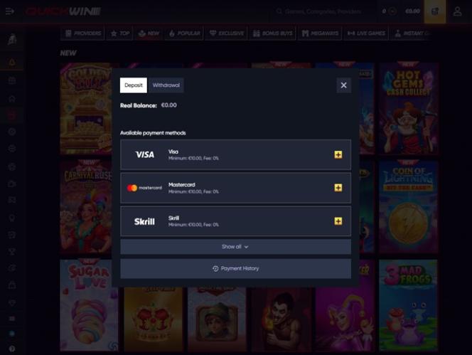 Operaattori keskittyy houkuttelemaan nettikasinopelaajia Saksasta , Suomesta, Norjasta, Kanadasta ja Uudesta-Seelannista, mutta Quickwin toivottaa tervetulleiksi myös muiden uhkapelialueiden pelaajat.