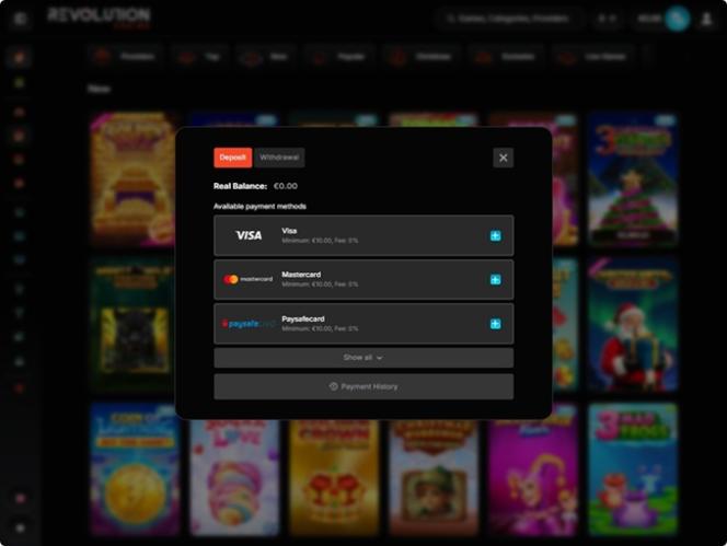 Maksuvaihtoehtojen osalta Revolution Casino tarjoaa pelaajilleen mahdollisuuden käyttää monia eri maksutapoja, kuten Visaa , Mastercardia , Jetonia , Netelleriä , Skrilliä , Neosurfia , Paysafecardia ja muita. Perinteisten maksuvaihtoehtojen lisäksi pelaajat voivat myös käyttää kryptovaluuttoja, kuten Bitcoinia, tallettaakseen ja nostaakseen rahaa.