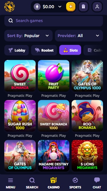 Roobet on moderni nettikasino, joka todella tarjoaa monipuolisia pelejä ja urheiluvedonlyöntiä. Voit nauttia valtavasta valikoimasta nettikolikkopelejä, live-jakajapelejä, pöytäpelejä ja crash-pelejä. Laajasta vedonlyöntisivustostamme voit lyödä vetoa monenlaisista urheilu- ja esports-tapahtumista.