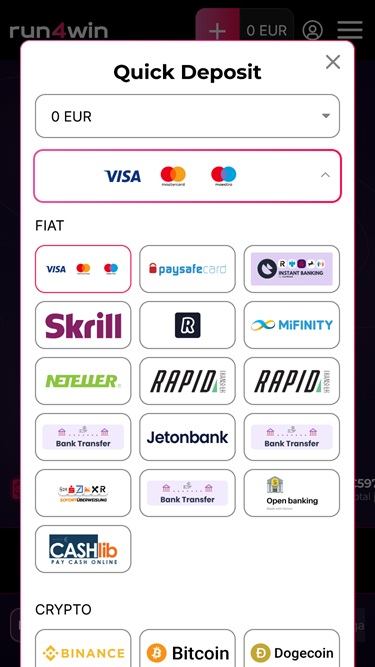 Run4Win Casinolla on runsaasti maksuvaihtoehtoja, ja pelaajat voivat käyttää maksutapanaan kryptovaluuttoja sekä muita suosittuja maksutapoja, kuten Visaa, Mastercardia, Netelleriä, Skrilliä, pankkisiirtoa , Astropayta ja muita.