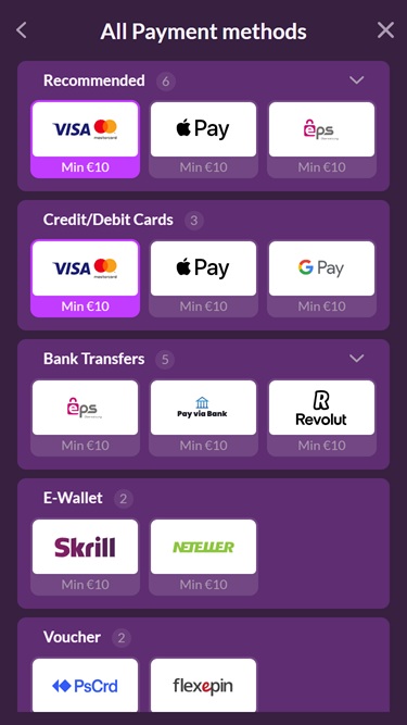 Alusta tarjoaa talletuksia ja kotiutuksia maailman parhaiden pankkimenetelmien kautta, mukaan lukien Apple Pay, pankkisiirto, Google Pay, Interac, NETELLER, Rapid Transfer, Revolut, Ripple, Skrill, maksukortit ja muut verkkopankkijärjestelmät ...
