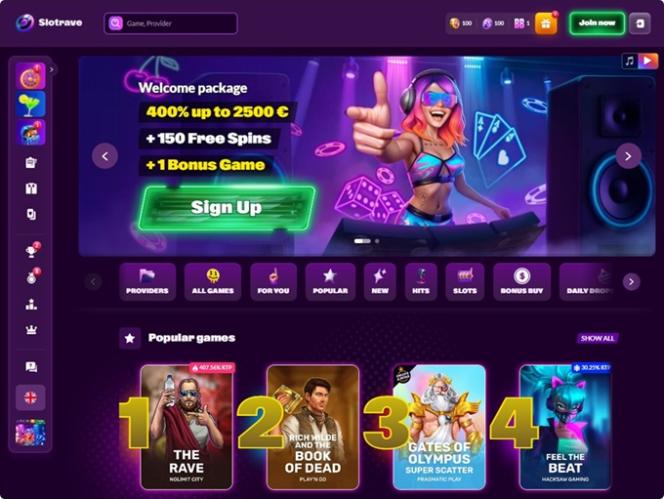 Slotrave Casino on nettikasino, joka keskittyy pääasiassa Kanadasta , Saksasta, Sveitsistä ja Itävallasta tuleviin pelaajiin. Tämä houkutteleva ja eloisa verkkosivusto on lokalisoitu tšekiksi, saksaksi, kreikaksi, englanniksi, espanjaksi, ranskaksi, unkariksi ja muille maailman kielille.