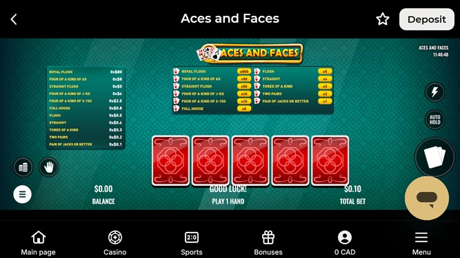 Pelaajien saatavilla on useita videopokeripelejä. Näihin kuuluvat Aces and Eights (yhden käden ja useamman käden), All Aces, Bonus Deuces Poker, Bonus Poker, Bonus Poker Deluxe, Deuces Wild (yhden käden ja 4–100 käden), Double Bonus Poker, Double Double Bonus Poker, Double Joker, Jackpot Deuces, Jacks or Better, Joker Poker, SupaJax ja Tens or Better.