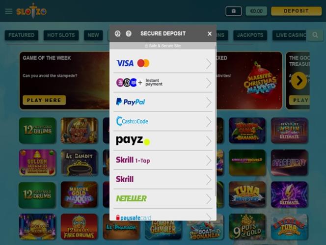 Slotzo Casinon takana on Amaya, Microgaming, Net Entertainment, BetSoft, 1x2gaming, Amatic Industries, Barcrest, Big Time Gaming, Evolution Gaming, EYECON, Ezugi, iSoftBet, lightningboxgames, Oryx, Play'n GO, playson, Quickspin, Yggdrasil, Wazdan, Realistic Games, Booming Games, Stakelogic, Pragmatic Play, GAMING1, Red Tiger Gaming, Spinomenal, Red Rake Gaming, Skillzzgaming, Fantasma Games, SYNOT Games, Skywind, Triple Edge Studios, Northern Lights Gaming, Stormcraft Studios, All41 Studios, Gluck Games, Gameburger Studios, Pulse 8 Studios, Shuffle Master, SpinPlay Games, Real Dealer Studios, Games Global, Wizard Games, Ainsworth, Bally Technologies, bluberi, Blueprint Gaming, Endemol Games, NextGen, Pariplay, Tom Horn Gaming, WMS, Inspired Gaming, Gaming Realms, SG Interactive, Gamomat, Red7Mobile, Scientific Games, Reel Time Gaming, Authentic Gaming, betiXon, Bally Wulff, Iron Dog Studio, Old Skool Studios, Foxium, Betdigital, Just For The Win, Reflex Gaming, PearFiction Studios, Wild Streak Gaming, Slingshot Studios, Fortune Factory Studios, RubyPlay, 4ThePlayer, AvatarUX, Gamevy, High 5 Games, ReelPlay, Alchemy Gaming, Snowborn Games, Hacksaw Gaming, Bang Bang Games, Slotmill, Peter And Sons, Lucksome Gaming, Area Vegas, Leap Gaming, Wishbone Games, Spribe, INO Games, Nailed It! Games, Atomic Slot Lab, Neko Games, Reel Kingdom, Oros Gaming, Indigo Magic and Light & Wonder , ja sivustolla on verkkopohjainen alusta, joka latautuu internetselaimesi kautta. Sivusto on hyvin suunniteltu ja helppokäyttöinen. Huomaat myös, että se on sisäänrakennettuna mobiiliyhteensopivuuden ansiosta, joten voit pelata älypuhelimellasi tai tabletillasi.