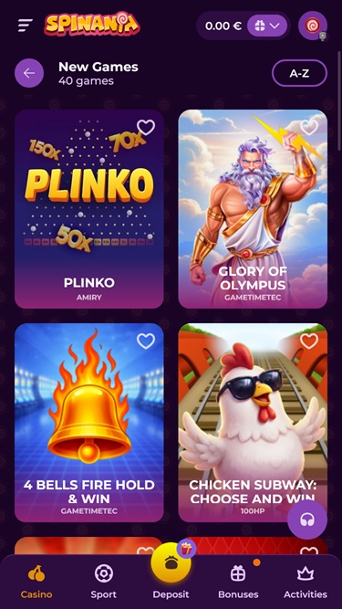 Lisäksi pikakaatumispelit ovat erittäin suosittuja Spinanian pelaajien keskuudessa, sillä ne antavat pelaajien hypätä nopeasti räjähtävään toimintaan ilman paljonkaan tietoa. Joitakin alkuperäisiä pikakaatumispelejä, joita voit pelata täällä, ovat Plinko, Chicken Road, Plinko 1000, Aviafly 2, Diver, Rock Paper Scissors, Rabbit Road ja Squid Gamebler.