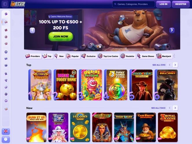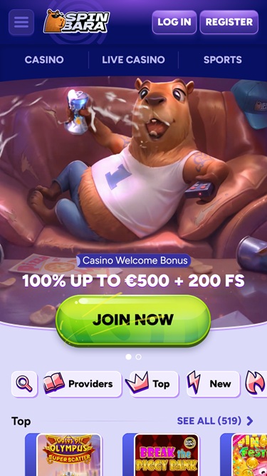 Heti sivustolle astuessasi sinua tervehtii täysin animoitu kapybara, joka rentoutuu sohvallaan ja nauttii kylmästä hiilihapollisesta juomasta. Tämä luo tunnelmaa koko sivustolle ja korostaa ajatusta siitä, että kaikkia kasinon mahdollisuuksia voi tutkia mukavasti kotoa käsin, mikä on siisti pieni yksityiskohta.