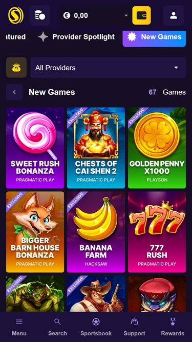 Sivuston vasemmalla puolella on laaja alasvetovalikko, jonka avulla pelaajat voivat navigoida kaikkiin pelikategorioihin. Näitä ovat kolikkopelit, livekasinopelit, uutuudet, pöytäpelit, peliohjelmat ja urheiluvedonlyönti. Näiden lisäksi käyttäjät voivat myös käyttää turnauksia, kampanjoita, asiakastukea ja blogeja alasvetovalikosta.