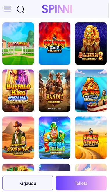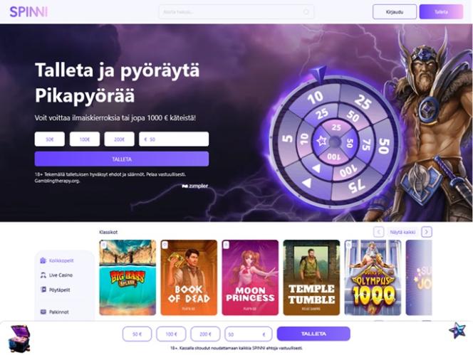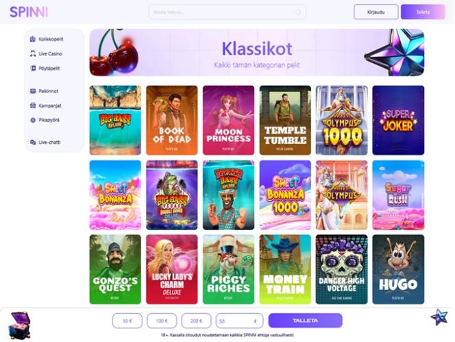 Spinni Casinolla pelaajat voivat kokeilla seuraavia pelejä: Wanted Dead Or A Wild, Barn Festival, Agent Jane Blonde Max Volume, Release the Kraken, Koi Princess, John Hunter And Book Of Tut, Joker's Jewels, 777 Strike, Zillard King, Fiery Sevens Exclusive, Might of Ra, 15 Tridents, Disco Beats, Big Wheel Wins, Break Da Bank Again, Christmas Big Bass Bonanza, Rainbow Gold, 25,000 Talons, Amazing Link Fates, Gorilla Riches, The Ultimate 5, Joker Pro, Fruits and Beyond, Fruit Party 2, Chicken Drop, Amazing Links Riches, Pearl Prizes, Book Of Captain Silver, 11 Enchanting Relics, 1524 Golden Quest, 1942: Sky Warrior, 3 Golden Wishes, 3D Blackjack, 3D European Roulette, 5 Star Knockout, 7 Deadly Spins, 7 Lucky Dwarfs, 777 Rainbow Respins, 9 Pots of Gold HyperSpins. Merirosvotehtävä, Dollars-pyöräytys, Ässät lentävät, Kapteeni Blackjackin seikkailut, Africa Goes Wild, Afterlife Inferno, Agentti Valkyrie, Alexandria City of Fortune, Alibaba ja 40 varkautta, Amerikkalainen hampurilainen, Apollo God Of The Sun, Tuhannen ja yhden yön aavikon kukka, Tuhannen ja yhden yön tarinoita kullasta, Arabian Spins, Arktinen lumoojatar, Arktiset hedelmät, Asia Wins, Astro Pandas, Atlantide, Ave Caesar, Aztar Fortunes ja paljon muuta.