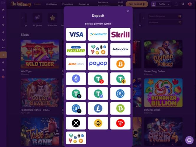 Maksuvaihtoehtojen osalta Godbunny Casino tarjoaa pelaajilleen paljon maksutapoja, kuten Visan, MasterCardin, Skrillin, Netellerin , Paysafecardin, AstroPayn, Jetonin ja paljon muuta. Operaattorit sallivat pelaajien myös käyttää kryptovaluuttoja pääasiallisena maksutapanaan.