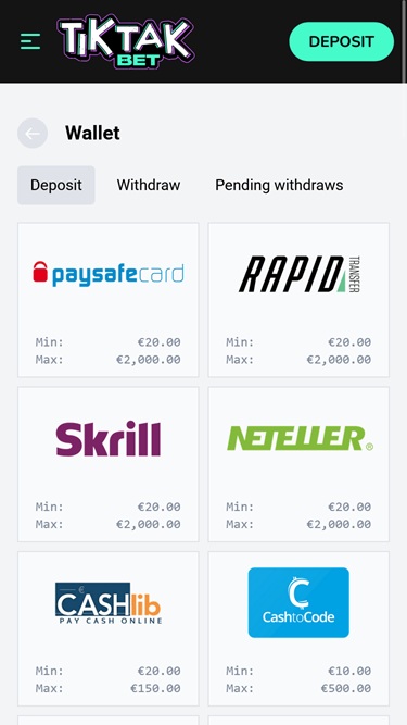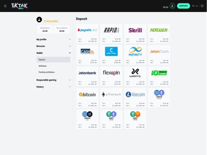 TikTak Betin kassa tukee luotettavia maksutapoja, kuten Apple Payta ja muita e-lompakoita, maksukortteja, tilisiirtoja sekä yli kahtakymmentä muuta perinteistä ja kryptovaluuttaratkaisua . Muista kuitenkin, että tietyt pankkipalvelut eivät ole saatavilla kaikilla lainkäyttöalueilla nettipelaamiseen.