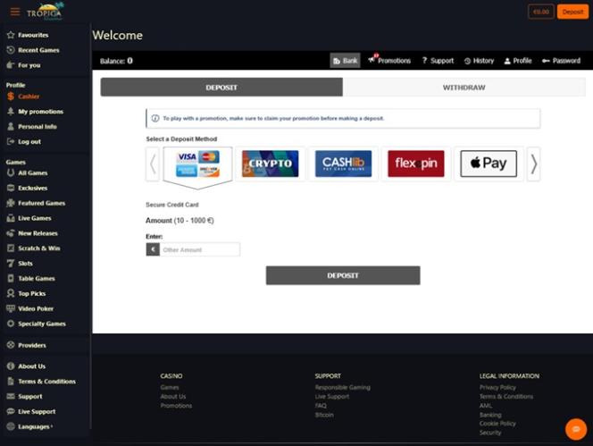 Tropica Casinon ohjelmistokehittäjä on BetSoft, Genesis Gaming, Rival, Saucify, Vivo Gaming, Arrows Edge, Radi8 Games, Fresh Deck Studios, Woohoo Games, Qora Games, Genii and Dragon Gaming , mikä tarjoaa laajan pelivalikoiman, jossa on pelejä, joita monilla amerikkalaisilla pelaajilla ei ehkä ole ollut mahdollisuutta kokeilla. Kasino on saatavilla ladattavana ohjelmistona sekä pikapelimallina, jonka avulla voit pelata suoraan verkkoselaimesi kautta.Muut pelit