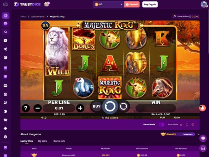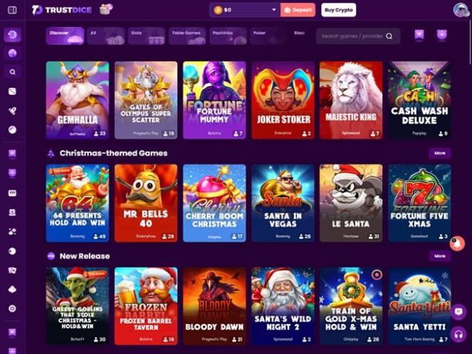 TrustDice tarjoaa melkoisen kattavan kolikkopelivalikoiman, ja sivustolta löytyy yli 900 erilaista peliä. Pelejä löytyy muun muassa Wazdanilta, Betsoftilta ja Endorphinalta. Saatavilla on useita erilaisia progressiivisia jättipotteja, ja valtaosaa kolikkopeleistä voi pelata myös mobiililaitteilla, jos haluaa.