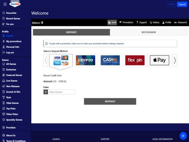 Pelasin monta kertaa tällä kasinolla ilman talletusbonuksia, mutta en voittanut mitään! Pienin kotiutus on 100 euroa ja sinun on nostettava se 100 euroon asti saadaksesi voittoja! Siksi se on niin vaikeaa käsitellä! Tämä on yksi tämän kasinon negatiivisista puolista! Pelit ovat siistejä, kuten rahataikuutta, oz-maailmaa, whale o'winsit, gushers kultaa ja kaivaa syvää!