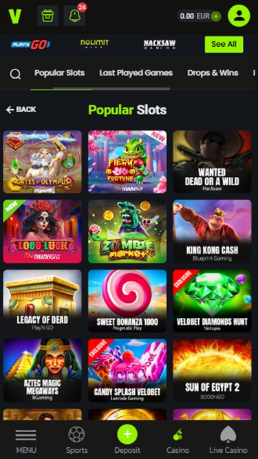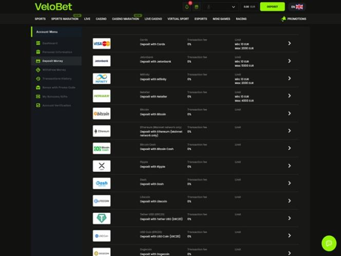 Kaikki Velobetin sisältö on hyvin jäsennelty ja järjestetty seuraaviin kategorioihin: Urheilu, Maraton, Live, Kasino, Livekasino, Virtuaaliurheilu, Esports, Minipelit ja Kilpa-ajo. Sieltä pelaajat voivat valita suosikkipelityyppinsä ja rentoutua nauttien tämän nettikasinon tarjoamasta hauskanpidosta ja viihteestä.