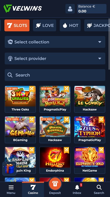 Velwinsin tapauksessa tarjolla ei ole pulaa upeista peleistä. Kasino on panostanut paljon tarjontaansa, ja verkkosivustollaan todetaan, että tarjolla on yli 9000 ainutlaatuista julkaisua, jotka ovat kehittäneet lähes 80 ohjelmistokehittäjää , joista useimmat tunnetaan vain korkealaatuisten pelien tuottamisesta.
