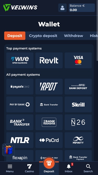 Voit hallita varojasi Velwins-kasinolla useilla maksutavoilla, mukaan lukien suositut vaihtoehdot, kuten Visa , Mastercard, pankkisiirto, Flexepin , Skrill , Neteller , MiFinity ja Paysafecard . Lisäksi pelaajat voivat käyttää lukuisia kryptovaluuttoja kelvollisina maksutapoina, kuten Bitcoin, Cardano , Dogecoin, Ethereum , Litecoin , Solana , Tron , USD Coin ja Tether.