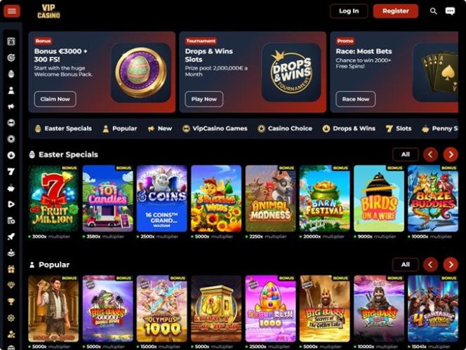 Vasemmalla oleva valikko mahdollistaa helpon navigoinnin. Painikkeet, kuten ilmainen raha ja tilisiirto, bonuskalenteri, suosikit, viimeaikaiset haasteet ja omat panokseni, ovat valikon yläosassa. Pelit-osiosta pääset osioihin, kuten suositut, uudet, VipCasino-pelit, kasinovalikoima, Drops & Wins, kolikkopelit, senttikolikkopelit, livekasino, pöytäpelit, crash game ja tarjoajat.