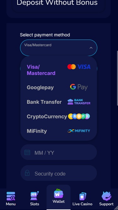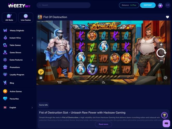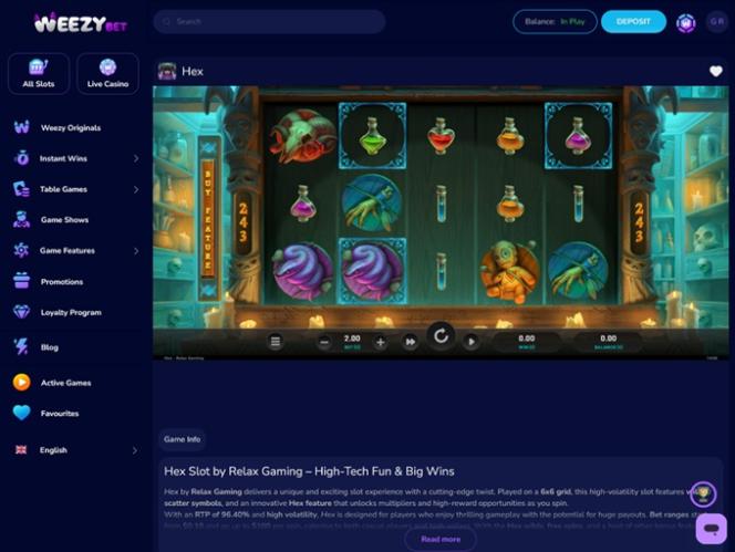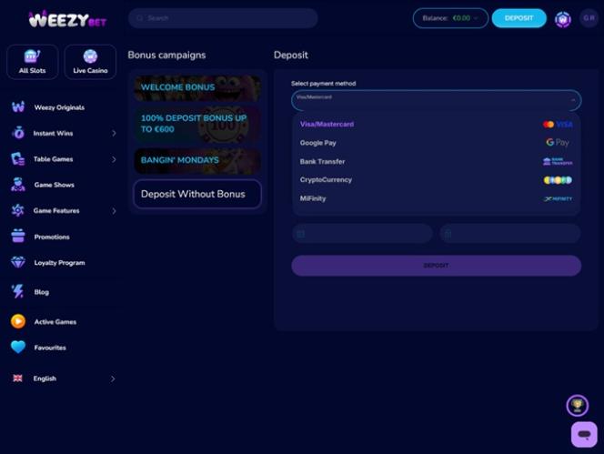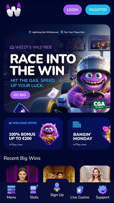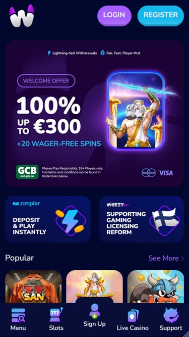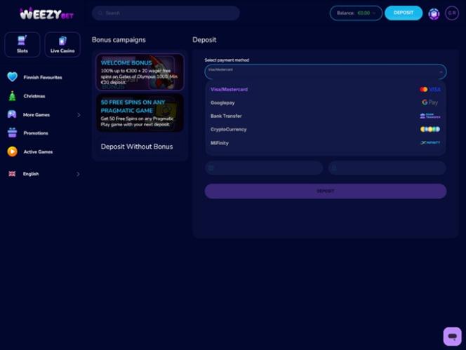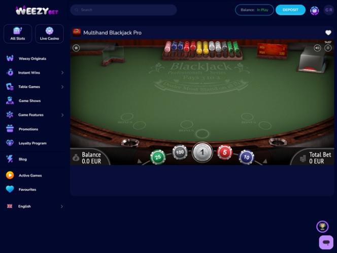 WeezyBet.com on käyttäjäystävällinen nettikasino, johon pääsee käsiksi sekä tietokoneilla että mobiililaitteilla. Joten riippumatta siitä, pidätkö enemmän PC-pelaamisesta vai kasinopelien pelaamisesta liikkeellä ollessasi , voit luottaa nopeisiin latausaikoihin ja miellyttävään käyttöliittymään kaikilla saatavilla olevilla alustoilla.