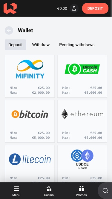 Kasino hyväksyy sekä fiat- että kryptovaluuttoja.