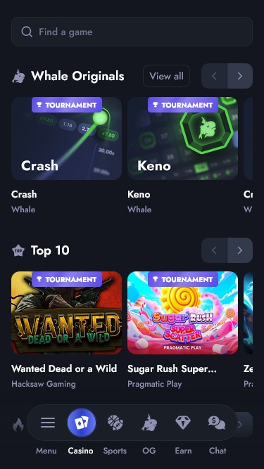 Toivomme, että olette yhtä innoissanne kuin mekin Whale.io:n valikoimasta! Ensi silmäyksellä näyttää siltä, että tarjolla oleva pelivalikoima on täynnä alkuperäisiä pelejä, pika- ja crash-pelejä , nettikolikkopelejä, live-jakajapöytiä blackjackiin , rulettiin , baccaratiin ja muuhun, sekä houkuttelevia urheiluvedonlyöntimahdollisuuksia vedonlyöntiosiossa.