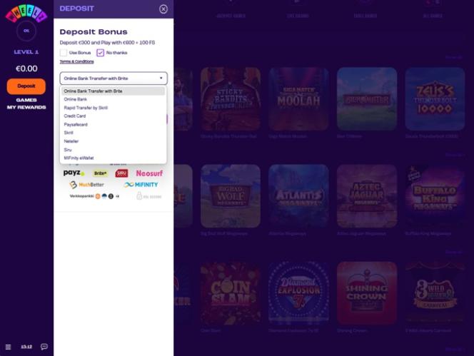 Periaatteessa kuten Wildz tai Caxino on hyvä kasino, minulle ainoa asia, josta en pidä, on suunnittelu enemmän tai vähemmän, David Haselhoff ja että minimitalletussumma on 20€. Se on erilaista heidän sisarkasinoissaan. Mutta kaiken kaikkiaan - hyvä 24/7-tuki, nopeat kotiutukset, paljon pelejä ja hyvä bonusjärjestelmä. Tarkista se!