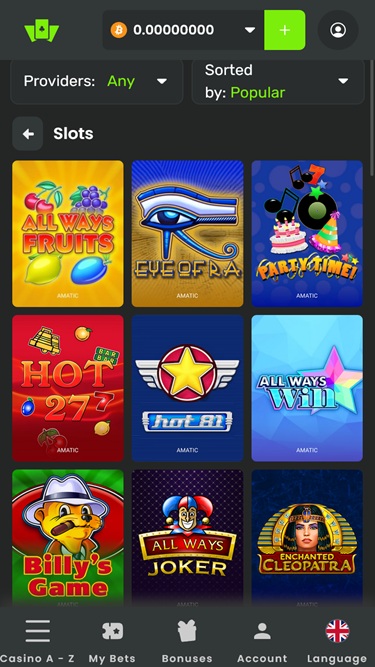 Yksi tärkeimmistä asioista, joita pelaajat arvostavat tässä nettikasinossa, on sen omistautuminen laajan kasinopelivalikoiman tarjoamiseen. Pelikirjasto on täynnä tuhansia jännittäviä pelejä, mukaan lukien lukuisia nettikolikkopelejä , live-jakajapelejä, pikavoittopelejä ja pöytäpelejä.