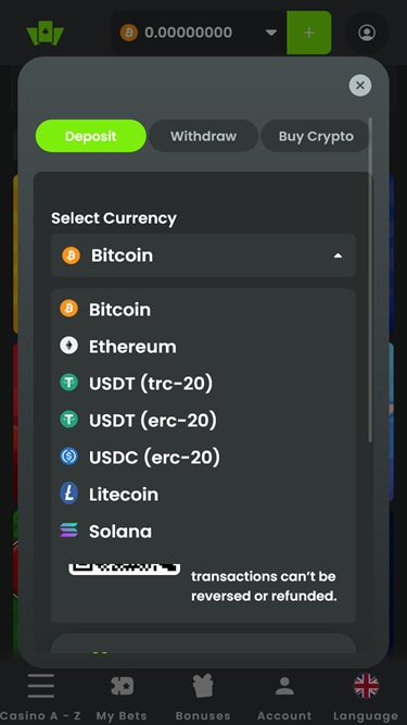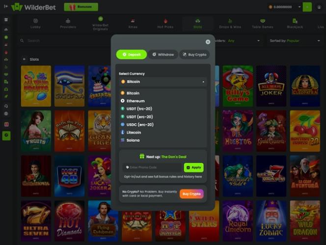 WilderBet Casino on ensisijaisesti kryptopainotteinen uhkapelisivusto, joka hyväksyy useita kryptovaluuttoja talletuksiin ja kotiutuksiin, mukaan lukien Bitcoin , Ethereum , Litecoin , Solana , USD Coin ja Tether. Pelaajat voivat myös käyttää perinteisiä maksutapoja, kuten Visaa , Mastercardia ja pankkisiirtoa, ostaakseen varoja suoraan verkkosivustolla.