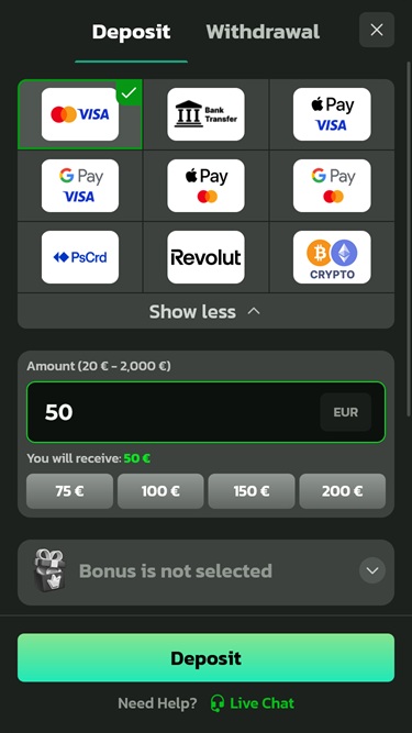 Apple Pay, Google Pay, Revolut ja muut verkkopankkipalvelut sekä pankkisiirrot, maksukortit ja muut vaihtoehdot ovat käytettävissä talletusten ja nostojen tekemiseen.