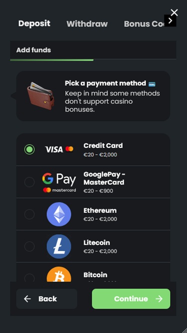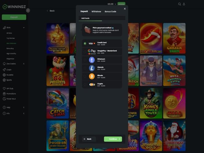 Winningz Casino tarjoaa useita maksutapoja , kuten pankkisiirron, Google Payn, Visan ja MasterCardin , sekä kryptovaluuttoja , kuten Bitcoin, Bitcoin Cash, Cardano, Dogecoin, Ethereum, Litecoin, Ripple, Solana, Tether, Tron ja USD Coin.