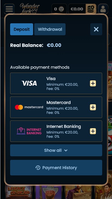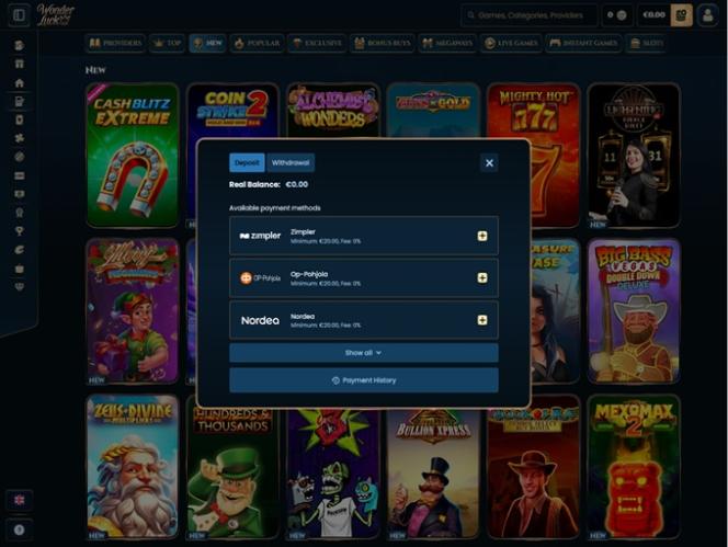 WonderLuckilla pelaajien käytettävissä ovat pankkisiirto, Neteller, Revolut, Skrill, maksukortit, muut verkkopankkipalvelut ja kryptovaluuttavaihtoehdot .