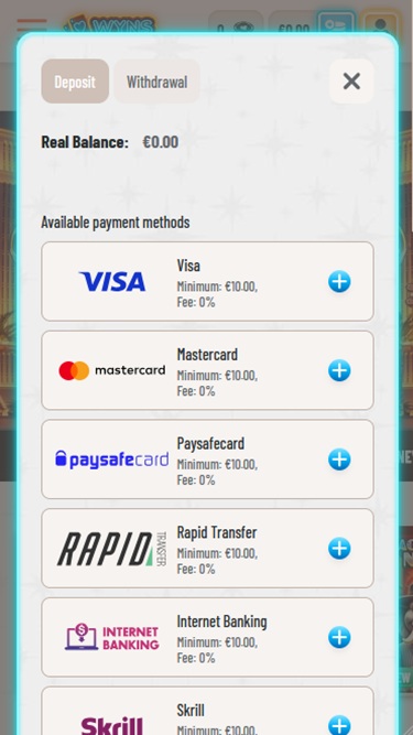 Wyns casino tarjoaa useita maksutapoja, kuten MiFinityn, pankkisiirron, Neosurfin, Nordean, Skrillin, Nettelerin, Visan ja MasterCardin, muutamia mainitakseni, sekä monia kryptovaihtoehtoja , kuten Bitcoinin , Bitcoin Cashin, Cardanon, Dogecoinin, Ethereumin, Litecoinin, Ripplen, Tetherin ja USD Coinin.