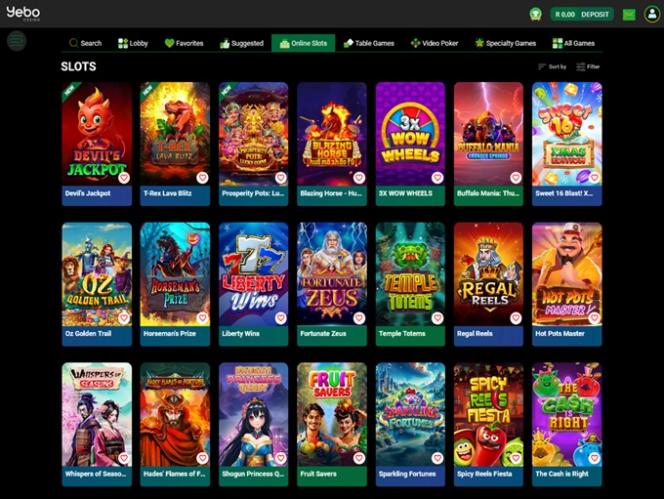 Yebo Casinon pelivalikoimasta löytyy hyvä valikoima sekä klassisia että moderneja videoslotteja, ja pelit, kuten The Big Bopper, Caesar's Empire, Lucky 6 ja monet muut, tuntuvat kasinolla. Tarjolla on myös progressiivisia jättipotteja suurilla rahapalkinnoilla, ja pelaajat voivat pelata monia kolikkopelejä myös mobiililaitteillaan.