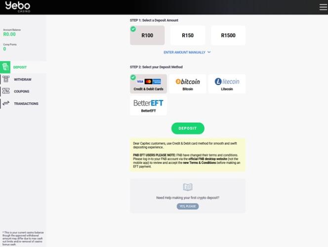 Yebo Casinon pankkijärjestelmä on melko vakaa, ja sivusto tarjoaa talletuksia ja kotiutuksia Skrillin, Netellerin ja ecoPayzin kautta. Talletukset hyväksytään myös Visalla ja MasterCardilla, ja kotiutuksia varten voi pyytää tilisiirtoa. Maksuaika on yleensä e-lompakoissa 24 tuntia, kun taas tilisiirto voi kestää 3–7 arkipäivää. Maksut suoritetaan 10 000 randin osissa.