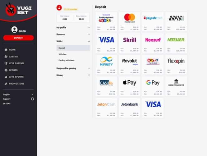 Pelaajat, jotka mieluummin käyttävät kryptovaluuttoja ensisijaisena maksutapanaan, pettyvät kuullessaan, ettei tällaisia vaihtoehtoja ole saatavilla. Toisaalta, jos haluat nostaa ja tallettaa rahaa suosituilla maksutavoilla, kuten Visa, Mastercard, Neteller, Skrill, Paysafecard, Neosurf, JetonCash ja muut, he ilahtuvat kuullessaan, että he voivat tehdä sen ilman minkäänlaisia ongelmia.