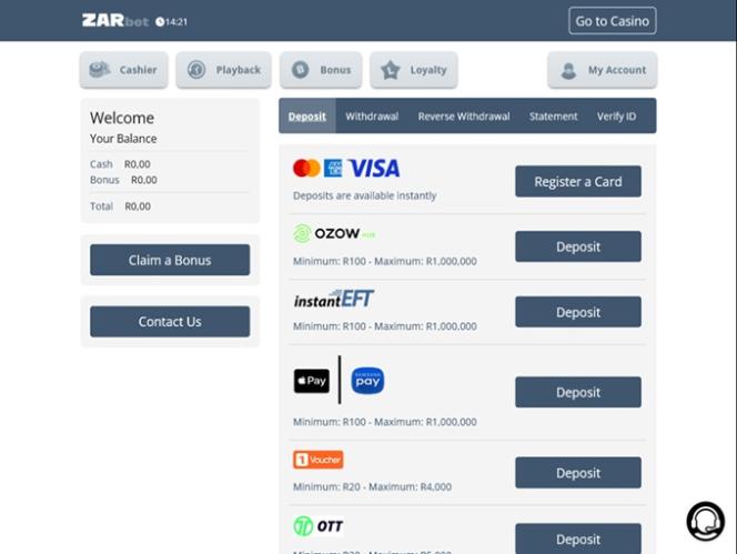 Maksuvaihtoehtoja ovat muun muassa maksukortit, Apple Pay, lahjakortit, lahjakortit, tilisiirto sekä kryptovaluuttojen maksuvaihtoehdot. Etelä-Afrikan randin lisäksi pelaajat voivat maksaa myös suosituilla digitaalisilla kolikoilla, kuten Bitcoinilla ja Litecoinilla.
