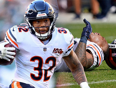 Chicago Bearsin keskushyökkääjä David Montgomery loukkasi polvensa ja nilkkansa ottelussa Houston Texansia vastaan.