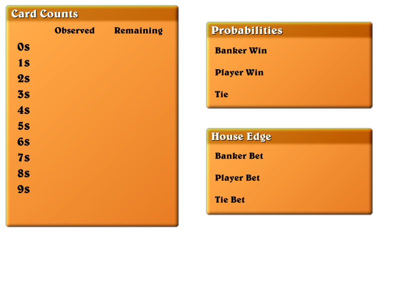 - Katso tilastotaulultamme yhteenveto viimeisimmästä jakajasta. Täältä löydät pankkiirin, pelaajan ja tasapelin panosten prosenttiosuudet. Saat myös jotain, mitä mikään kasino ei anna sinulle: talon edun samoista kolmesta panoksesta jäljellä olevien korttien tarkan koostumuksen perusteella. Joskus pelaajalla on etu jakajakentän loppuvaiheessa. Lopuksi, korttien laskijoille teemme asioiden helpoksi näyttämällä, kuinka monta kutakin arvoa on jäljellä jakajakentässä.