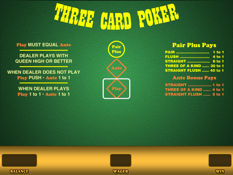 - Jokainen pelaaja kilpailee jakajaa vastaan, ja peli sallii erityyppisiä panoksia, kuten "Ante", "Play" ja "Pair Plus" -panokset.