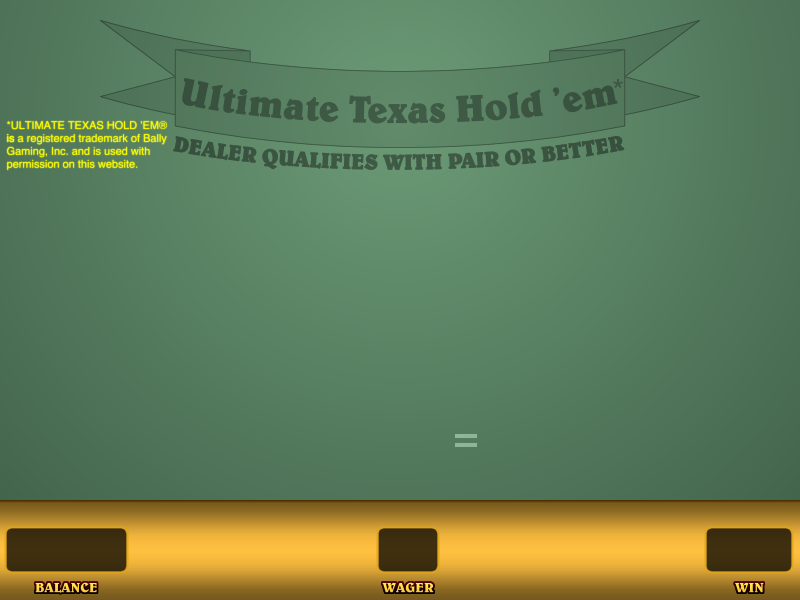 Nauti seuraavasta Online Ultimate Texas Hold 'Em® -pelistä. JavaScript vaaditaan vähintään. Myös Java vaaditaan täydellisten neuvojen antamiseen. Jos Javaa ei ole asennettu tai käytössä, strategianeuvoja 2x korotuksen päätökseen voidaan antaa vain ilmeisissä tilanteissa (korotus suoralla tai paremmalla).