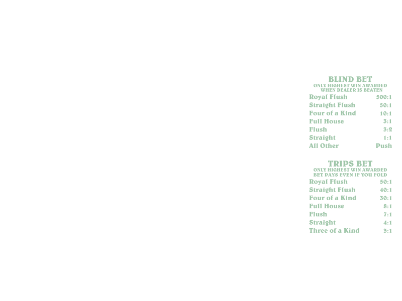 - Voittorakenne : Voittorakenne vaihtelee käden tuloksen mukaan. Sekä Ante- että Play-panosten voittaminen maksaa yleensä tasarahat, kun taas Blind-panos tarjoaa kasvavia voittoja käden vahvuuden mukaan.