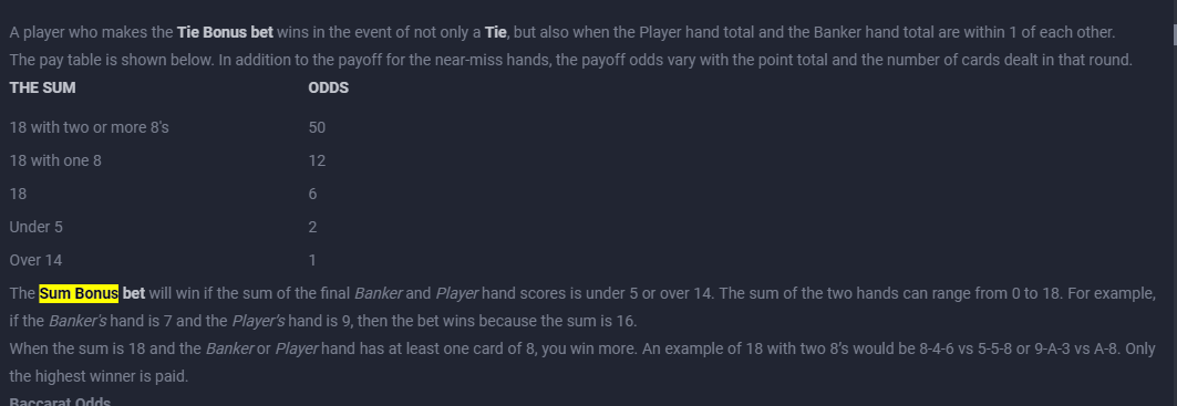 - Summabonus : ? (Ohjetiedostossa mainitaan tämä panos, joka maksaa pelaajan ja pankkiirin käsien pisteiden summan perusteella, mutta en löydä kohtaa, johon sen voisi asettaa pöydällä. Käytän vaivaa analysoidakseni sen, kun olen varma, että panoksen voi asettaa mihin tahansa, jotenkin.)