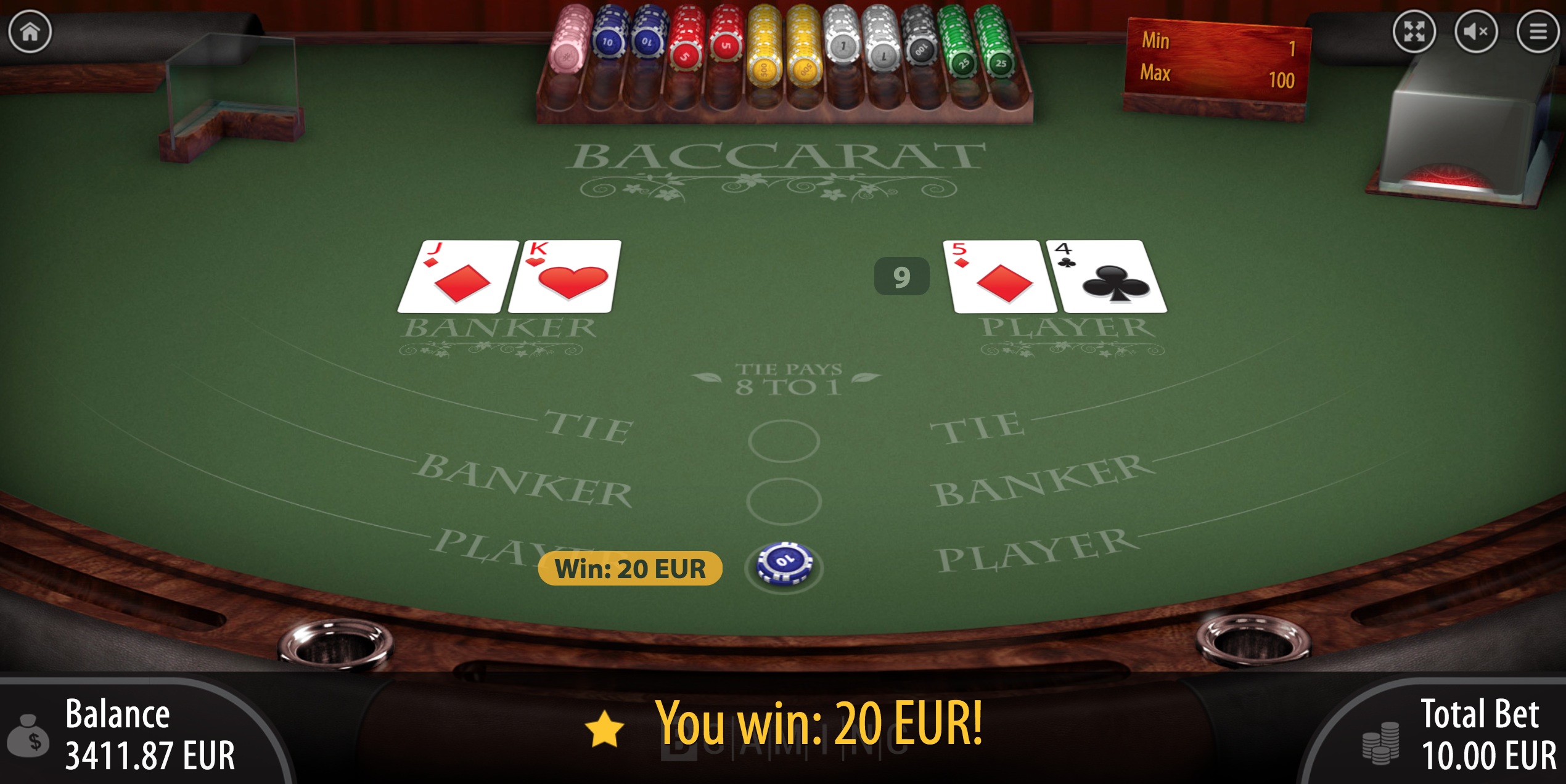 Baccarat -peli on melko tavallinen. Siinä on vain kolme pääpanosta: pankkiiri, pelaaja ja tasapeli. Tasapeli-panoksella voittokertoimet ovat niukat 8:1.