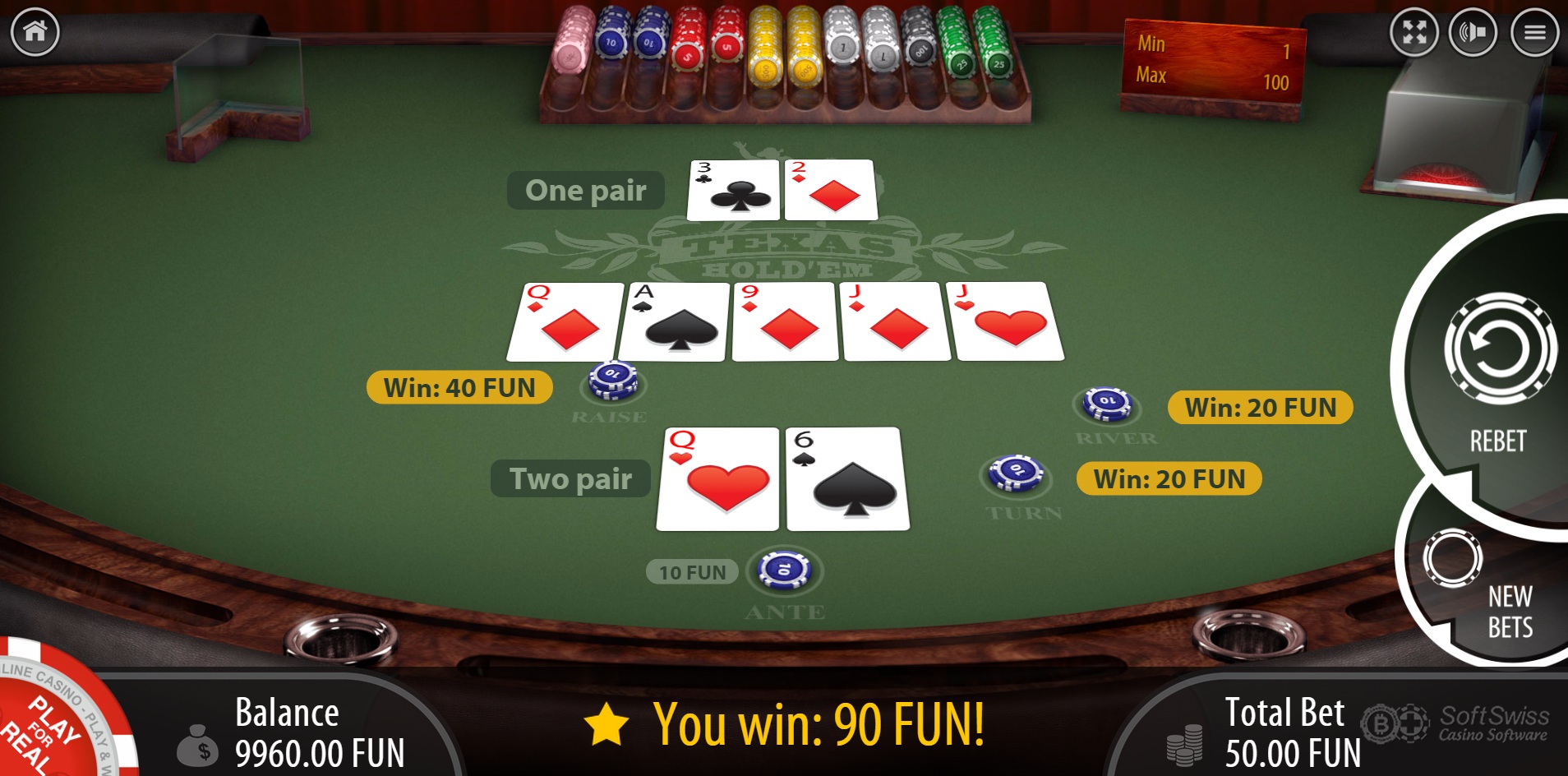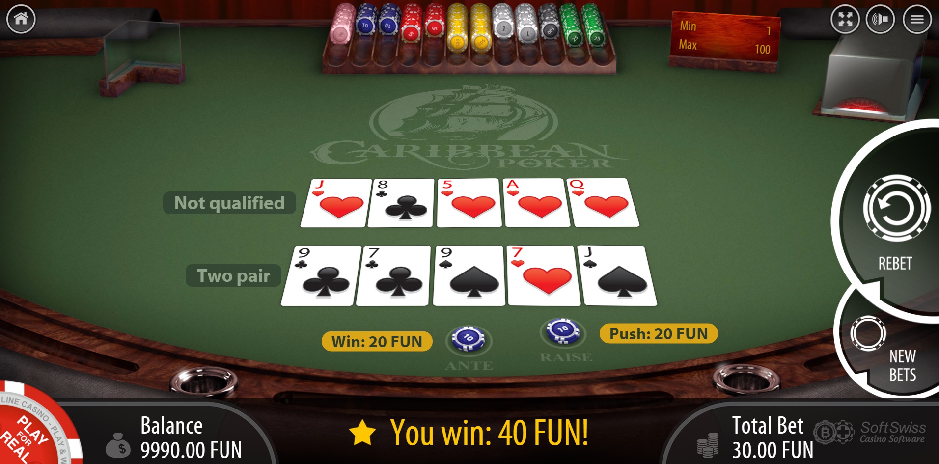 BGAMING noudattaa Texas Hold 'Em Bonuksen liberaaleja Las Vegasin sääntöjä, joissa aloituspanos maksetaan suoralla tai paremmalla, jolloin talon etu on 2,04 %. Pelin ohjetiedostossa sanotaan tuoton olevan 98,75 %, mitä en kiistä. Oletan, että he mittaavat sen odotetun tuoton suhteena kaikkiin panostettuihin rahoihin.