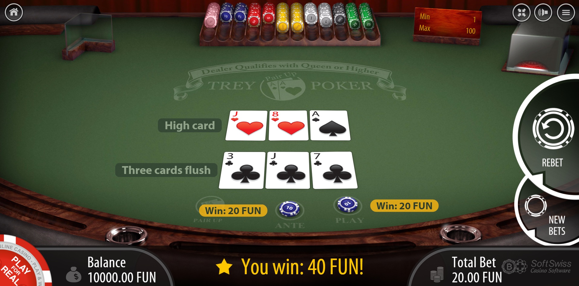 BGaming kutsuu Three Card Poker -peliään Trey Pokeriksi. Ante Bonus noudattaa tavanomaista 1-4-5-maksutaulukkoa, ja talon etu on 3,37 %. Normaalisti Pair-Plus-panokseksi kutsuttua Pair Up -panosta he kutsuvat Pair Up -panokseksi, joka noudattaa 1-3-6-30-40-100-maksutaulukkoa (mukaan lukien 100 mini-kuninkaalle) ja talon etu on 5,10 %.