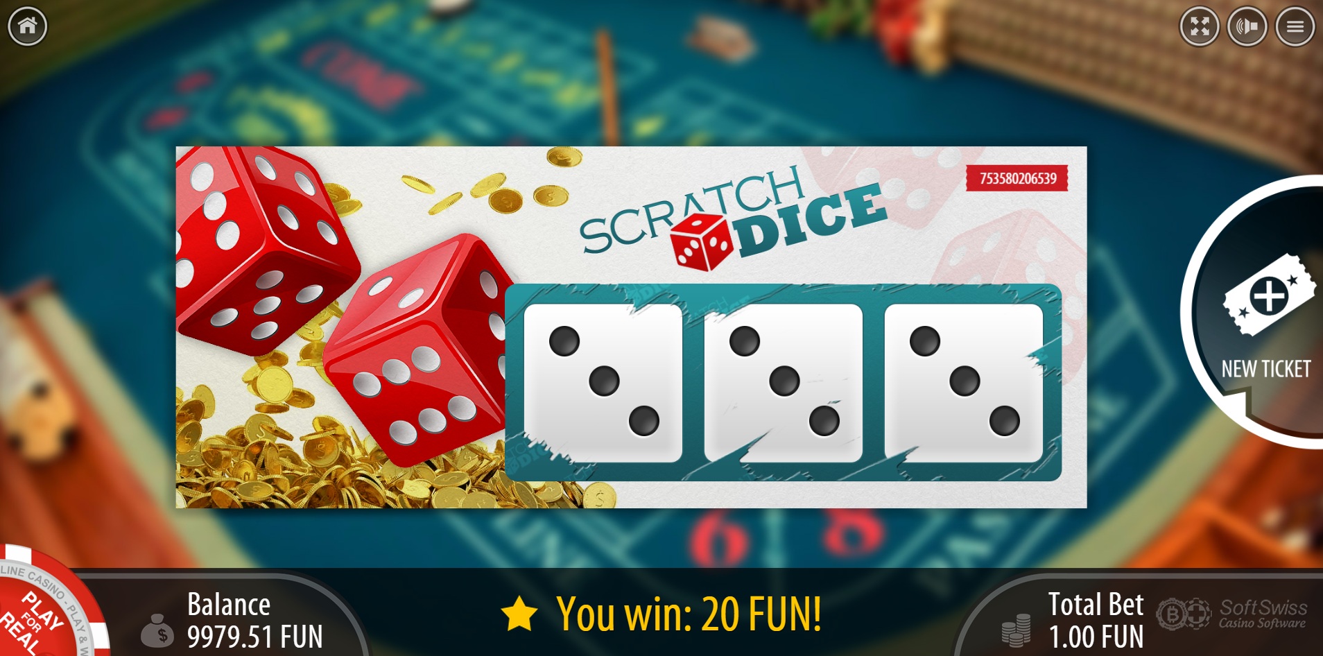 Tämä on yksinkertainen raaputusarpapeli, joka perustuu kolmeen noppaan. Lopputulos on 2,78 %:n talon etu. Lisätietoja on Raaputusarpasivullani .