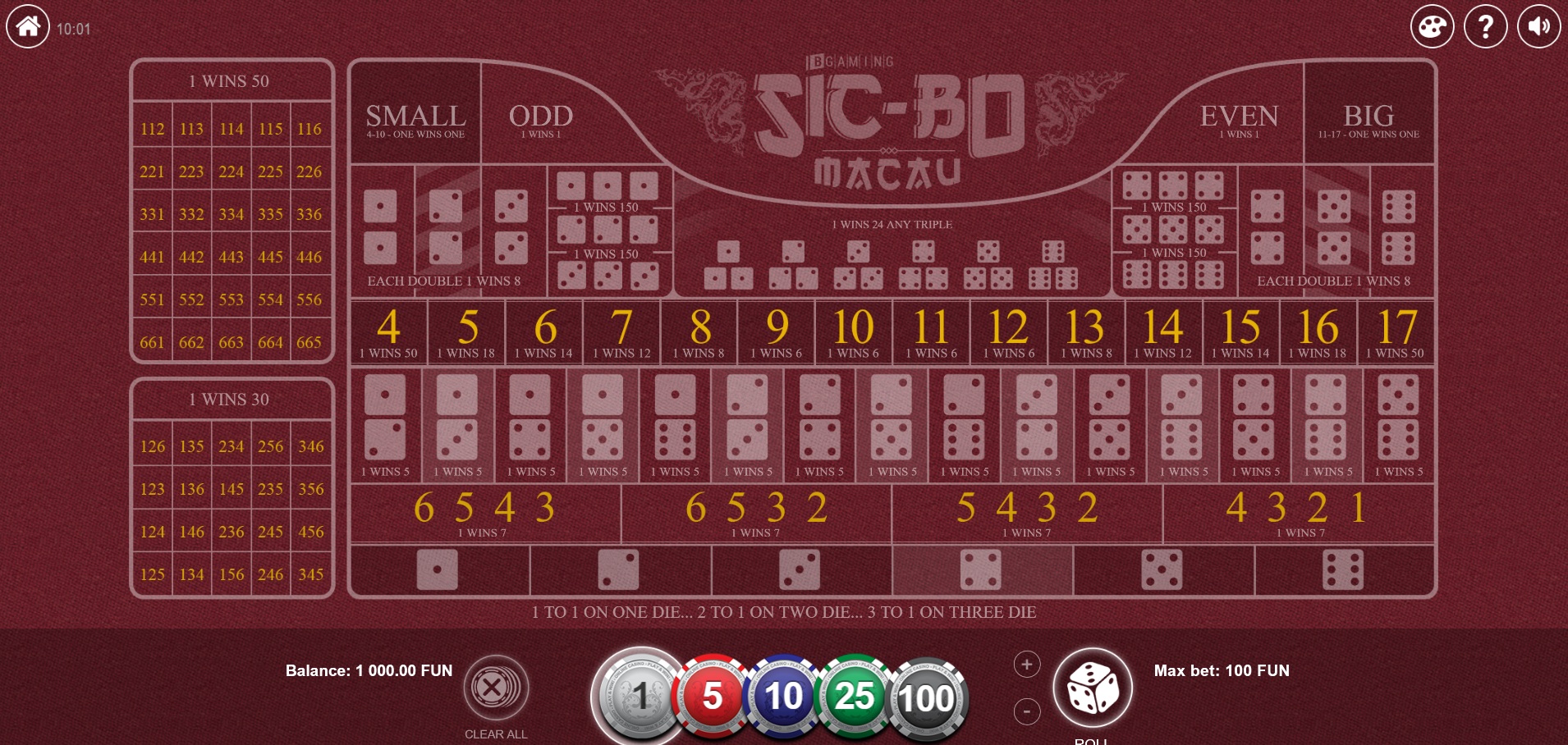 Bgaming tarjoaa kaksi sic bo -peliä. Sinisellä pöydällä olevaa peliä kutsutaan nimellä "sic-bo" ja punaisella pöydällä olevaa "sic -bo Macau". Pidän siitä, että he kirjoittavat Macaon au:lla (o:n sijaan), mutta en pidä siitä, miten he yhdistävät sic bo:n yhdysmerkillä. Molempien pelien kertoimet ovat melko pienet, mutta Macaon peli on huonompi. Itse asiassa minun on todella moitittava heitä siitä, että he maksavat vain 18:1 5:1 ja 16:1 panoksilla, mikä vastaa 47,22 %:n talon etua!