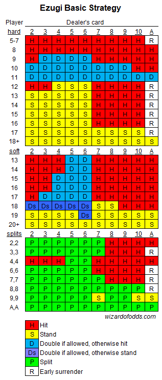 Ässän varhaisen antautumisen säännön ansiosta, jonka arvo on pelaajan kannalta 0,39 %, talon etu on hyvin pieni 0,11 %. Ohjetiedostoissa sanotaan virheellisesti tuoton olevan 99,50 %. Perusstrategia on seuraava: