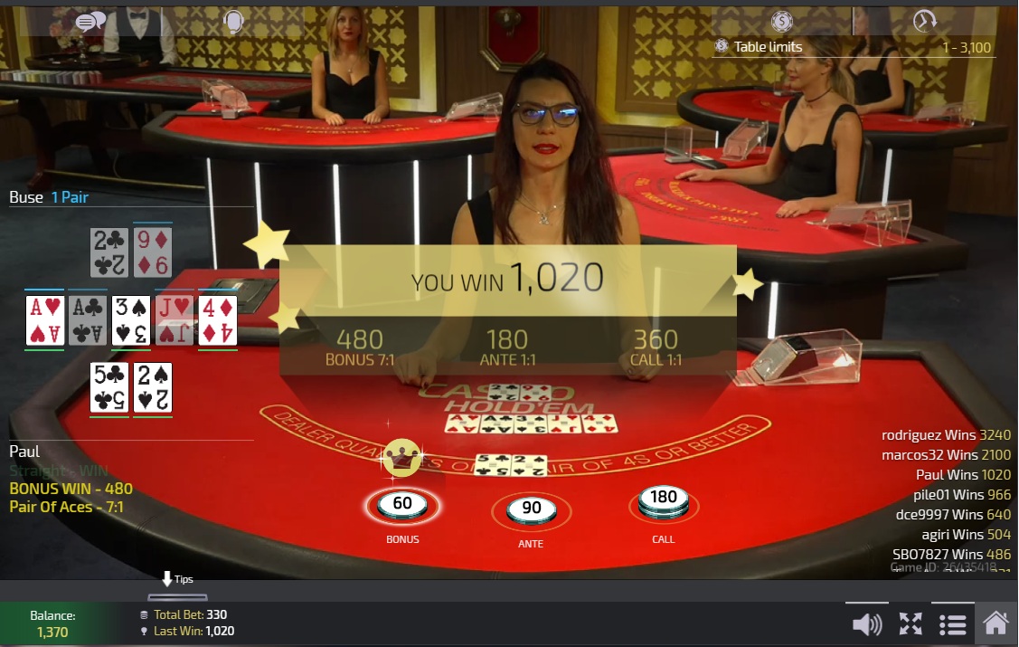 Casino Hold 'Emiä tarjotaan tavallisilla säännöillä. Ante-panoksella noudatetaan 100-20-10-3-2-1-maksutaulukkoa, jolloin talon etu on 2,16 %. Bonuspanos noudattaa 100-50-40-30-7-7-7-7-7-7-7-7-7-7-maksutaulukkoa, jolloin talon etu on 6,26 %.