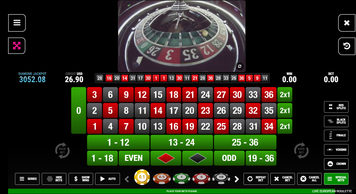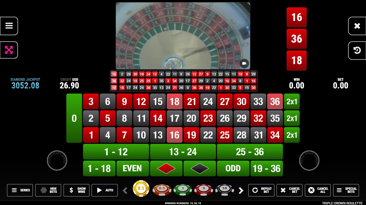 - Triple Crown – Tämäkin on kamerasyöte automaattisesta pelistä, mutta tässä on kolme samankeskistä rulettinumerorengasta ja yksi pallo. Jokainen panos on kuin kolme panosta, yksi jokaiselle renkaalle. Mukana on myös Triple Poker -sivupanos pokerin arvosta kolmen tuloksen välillä. Tällä sivupanoksella on 4,83 %:n talon etu. Lisätietoja ja analyysi aiheesta on Triple Poker -sivullani.